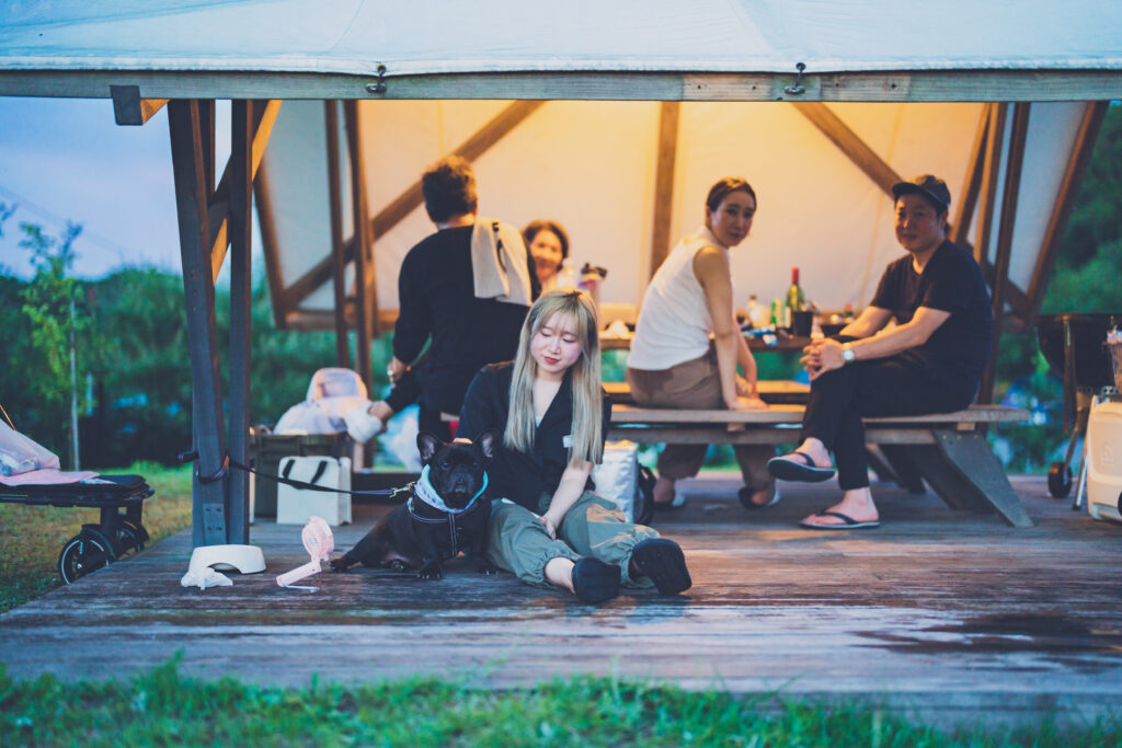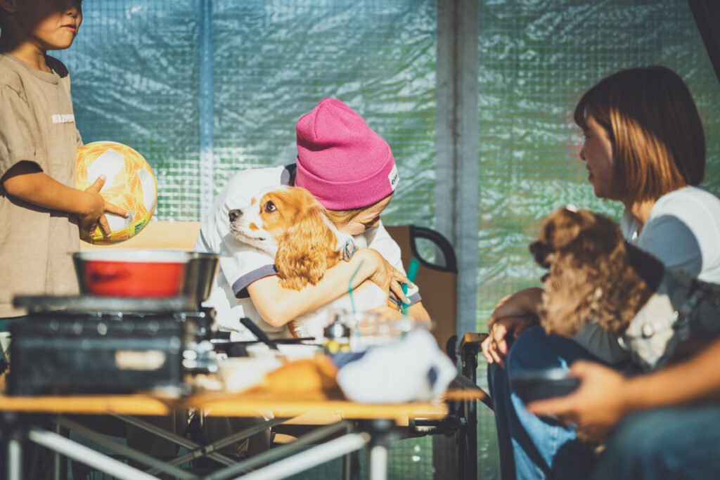 リードを付けてのんびり歩いたり、テントで一緒に過ごしたり、