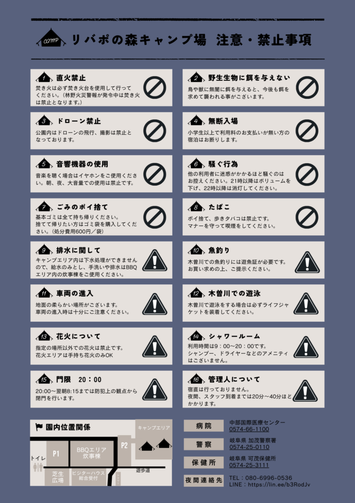 • 直火禁止(焚き火台をご使用ください。林野火災警報が発令中は焚き火は禁止となります。)