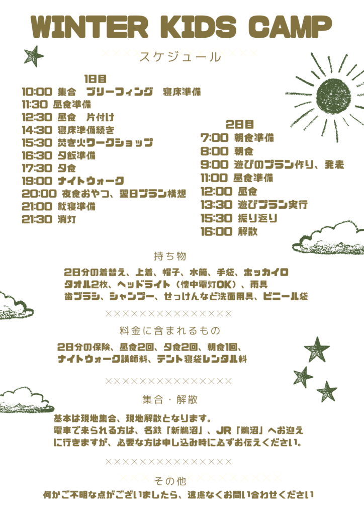 • 2日分の着替え、上着、帽子、水筒、手袋、ホッカイロ